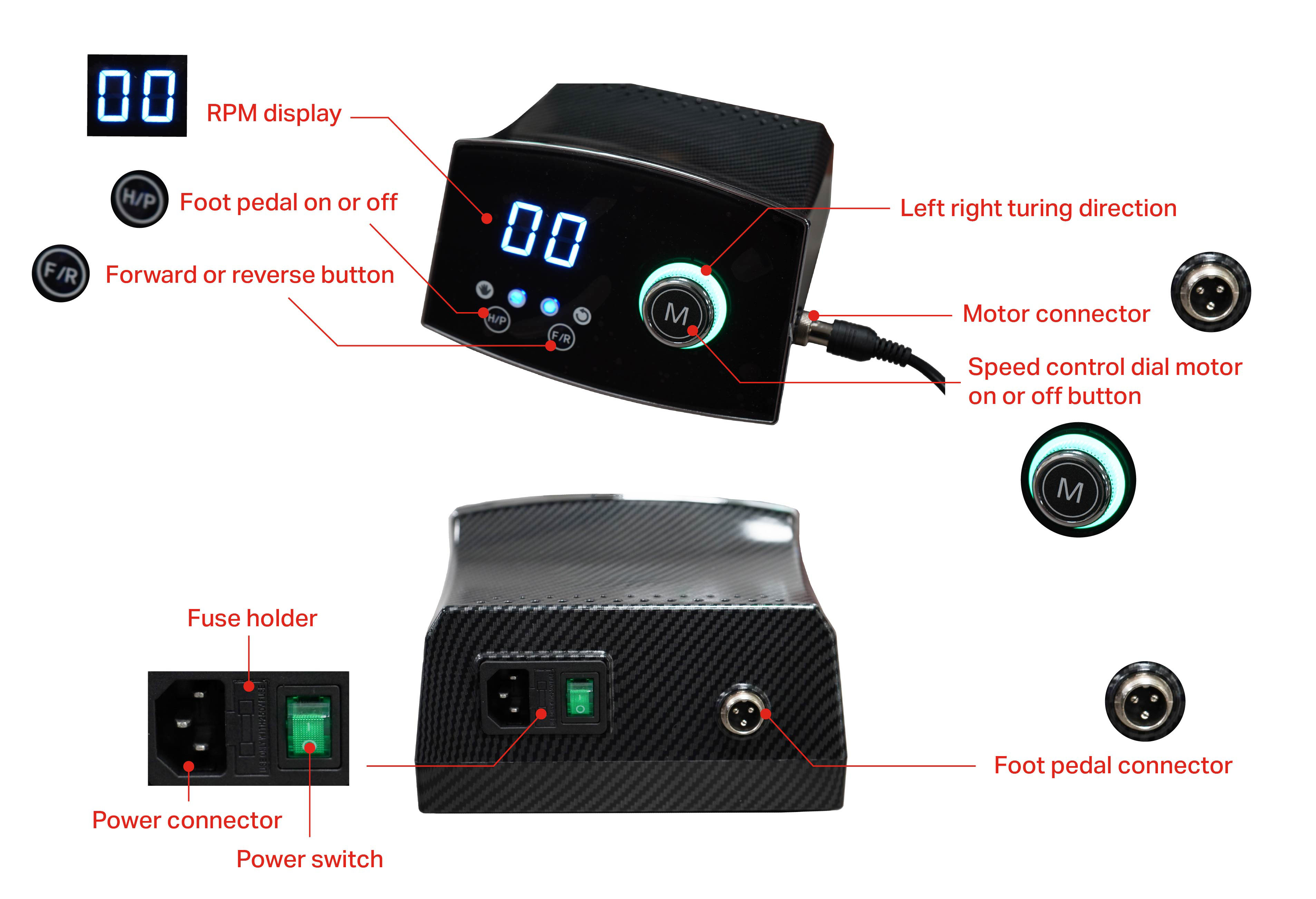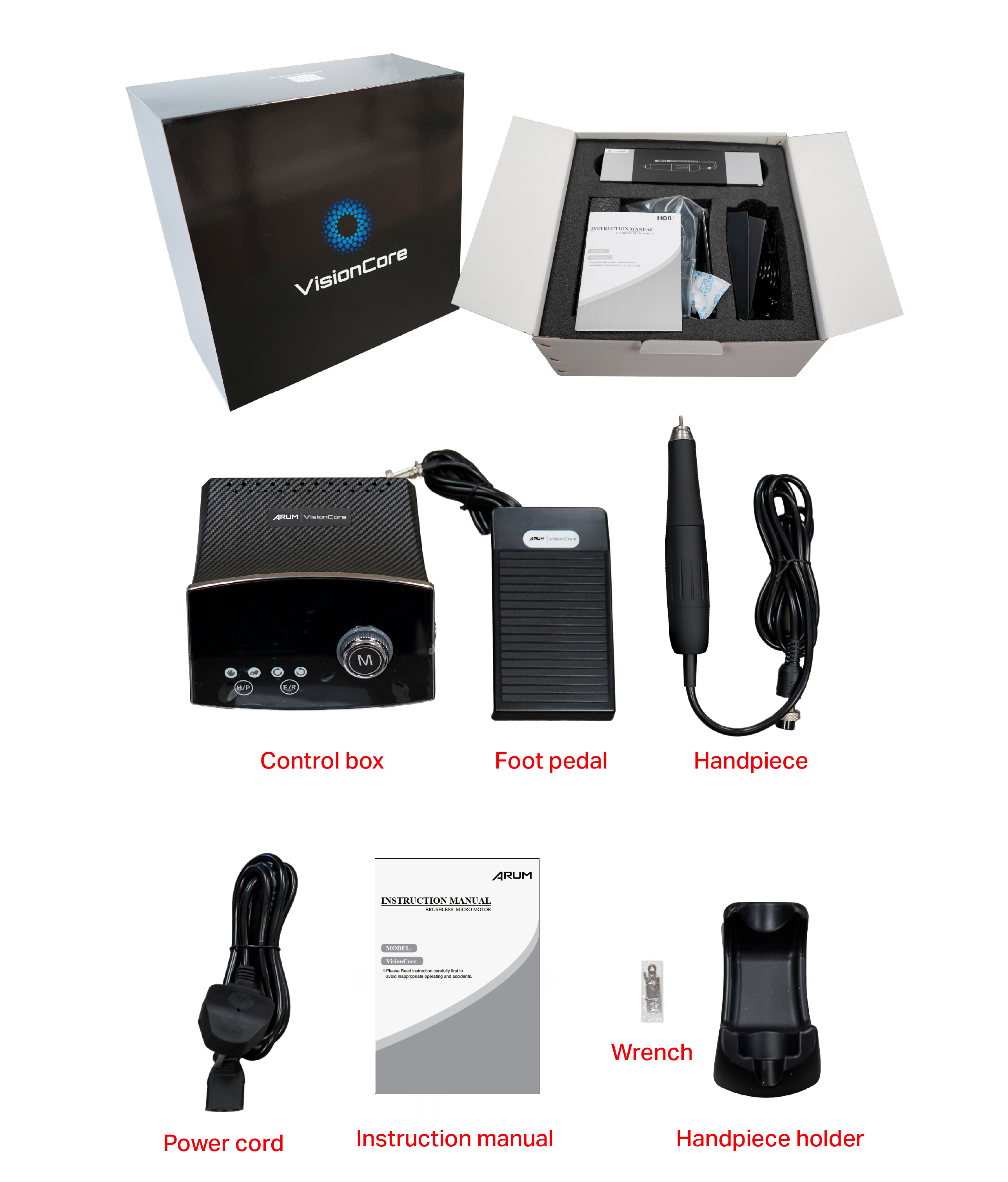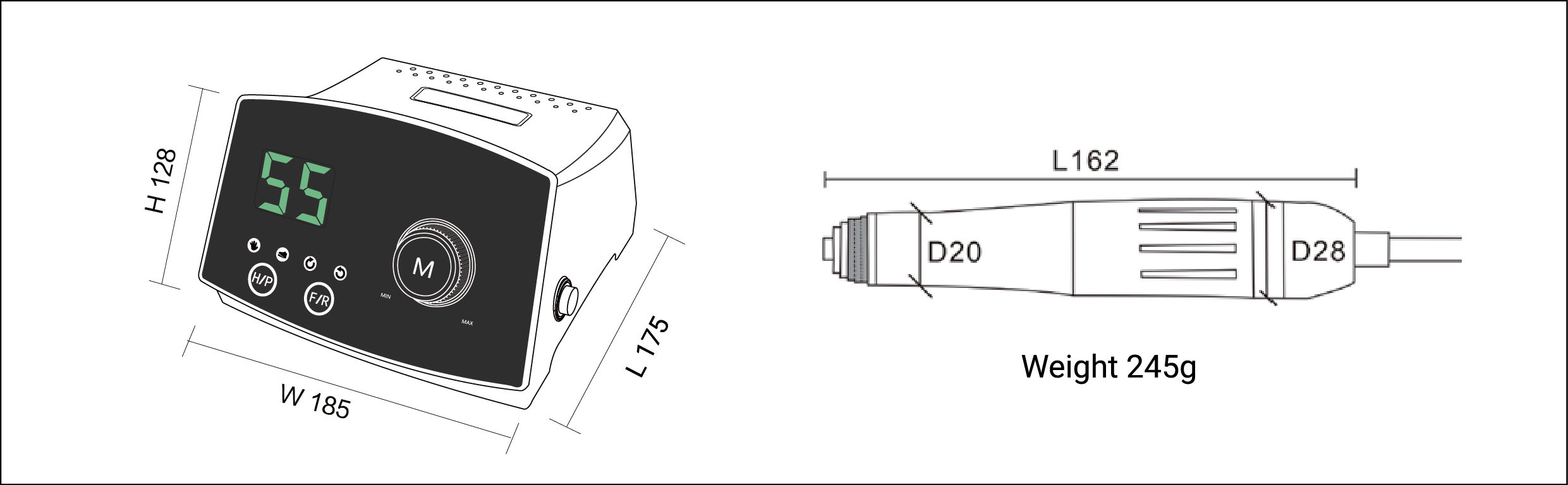 Brushless motor Speed: Max 55,000 RPM Torque: 8.5 Ν/cm Manual or pedal speed control Displayed speed Right and left turning ability Self-diagnosis with error display, and automatic stop system for overload protectionLow noise & Temperature control Certification: ISO900, CE